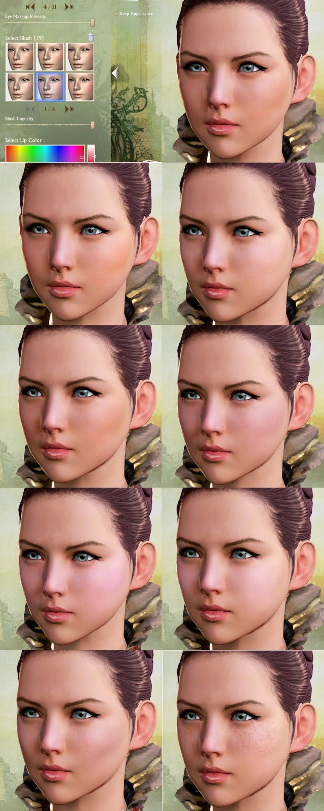 Now, don't get me wrong. Having cool dirt/warpaint/feature options is awesome, and I think tons of people love that, including myself. But I've never seen a game with actual eyeshadow, eyeliner, blush, and lip options that are THIS sophisticated. Most games I've played have 4-6 "makeup" options that minimally change the character's "eyeshadow" color.